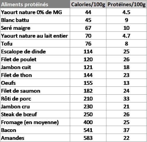 La solution la plus simple à mes yeux est de supprimer les féculents (pâtes, riz, pommes de terre, pain, etc…) d’un repas. Vous diminuerez alors l’apport de 100 à 150 kcal. Vous pouvez également diviser par 2 les portions de féculents de 2 repas. Une autre approche est de sélectionner des aliments protéinés pauvres en calories. Voici un tableau de l’Entrainement 3D spécial malbouffe qui vous aidera à y voir plus clair :