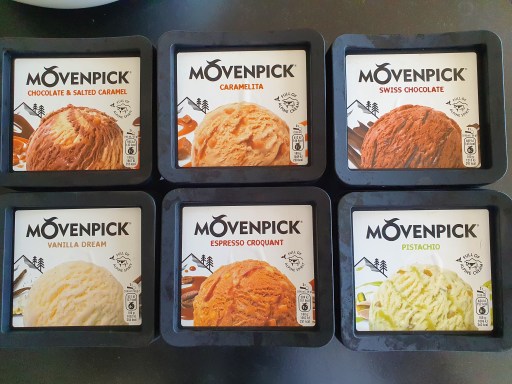 Chaque fabriquant a sa propre recette, les calories peuvent donc varier d’une marque à l’autre, mais également d’un parfum à l’autre. Je suis un grand fan des glaces Mövenpick, j’ai donc fait une petite comparaison de certaines glaces de cette marque (pistache, chocolat, vanille, café/mocca/espresso croquant, caramel, voir détails sur la photo ci-dessous) : on voit que la teneur en calories pour 100 grammes va de 250 à 291 calories (+16%). Ce n’est pas gigantesque, mais ça fera une différence si vous mangez une grande quantité de glace.